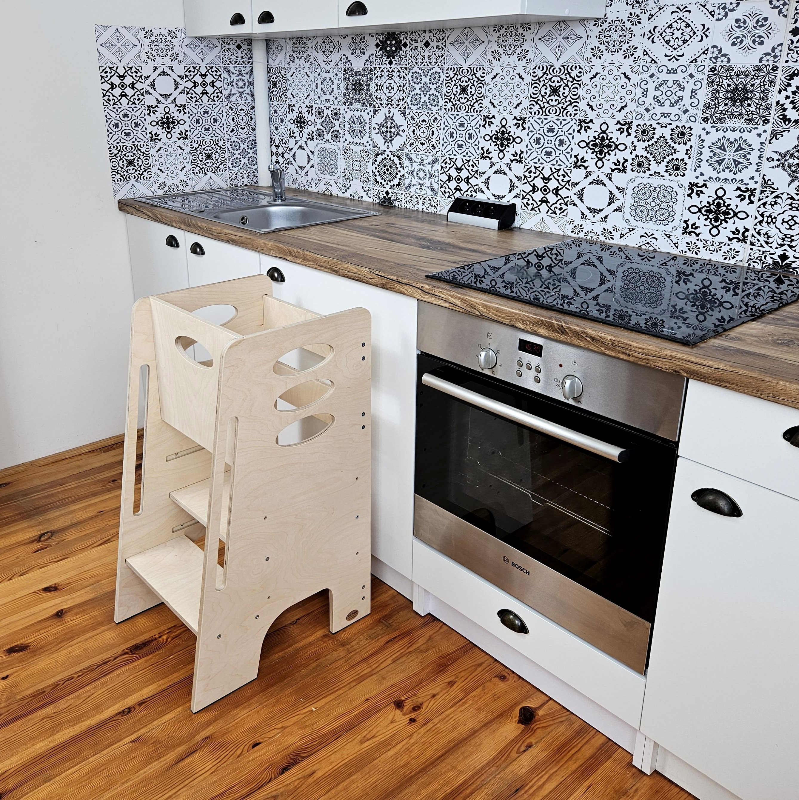 Szukasz pomocnika do kuchni, który zapewni bezpieczeństwo przy pracy z dzieckiem. Zapomnij o szurających po podłodze taboretach, krzesełkach czy hokerach, które lubią niespodziewanie odsuwać się od blatu. Od teraz Twoje dziecko będzie bezpieczne i szczęśliwe, że może pomagać, a Ty będziesz miała spokojną głowę. Nasz kitchen helper powstał po to, żeby dać Ci niezapomniane chwile, które spędzisz z pociechą podczas przyrządzania wspólnych posiłków lub na innych zabawach w kuchni.