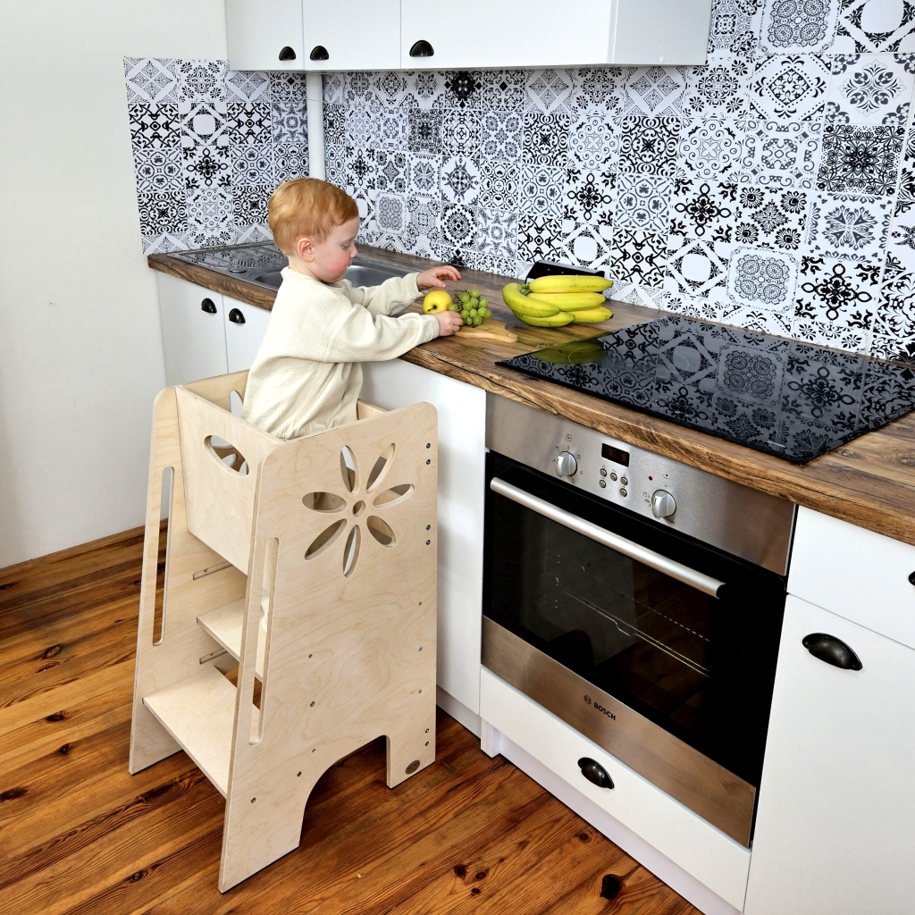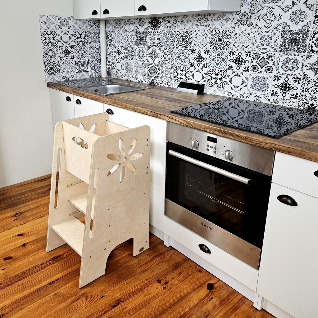 Szukasz pomocnika do kuchni, który zapewni bezpieczeństwo przy pracy z dzieckiem. Zapomnij o szurających po podłodze taboretach, krzesełkach czy hokerach, które lubią niespodziewanie odsuwać się od blatu. Od teraz Twoje dziecko będzie bezpieczne i szczęśliwe, że może pomagać, a Ty będziesz miała spokojną głowę. Nasz kitchen helper powstał po to, żeby dać Ci niezapomniane chwile, które spędzisz z pociechą podczas przyrządzania wspólnych posiłków lub na innych zabawach w kuchni.